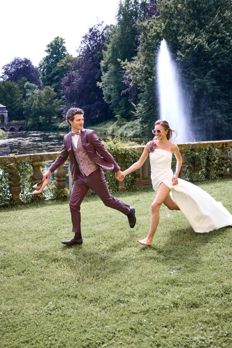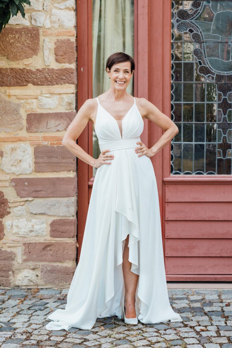 Gleichzeitig spielen wir aber auch gerne mit den unterschiedlichsten Stoffen und sind bei unserer Brautmode immer auf der Suche nach neuen und innovativen Materialien. Besondere, dehnbare, fließende und unglaublich angenehme Stoffe stehen bei unserer Designerin Kerstin hoch im Kurs. Ziel ist es schließlich, dir wunderschöne Hochzeitskleider Designs mit größtmöglichem Tragekomfort zu entwerfen, damit du dich an deiner Hochzeit wohl in deiner Haut fühlst! Und wir fühlen uns geehrt, wenn eines unserer langen Hochzeitskleider Teil deines großen Tages sein darf. Deswegen freuen wir uns riesig, wenn du uns nach deiner Hochzeit ein Bild für unsere Real Brides Galerie (realbrides@kuessdiebraut.de) schickst!