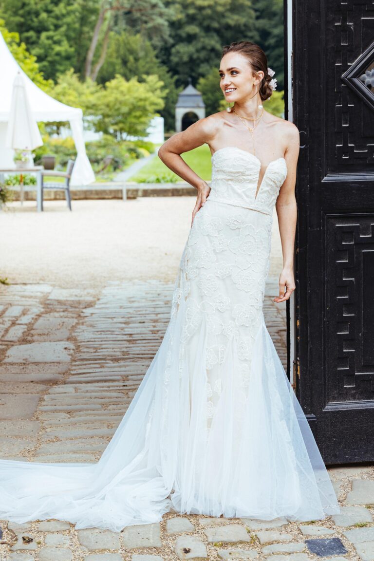 Generell gilt: ein Brautkleid muss gar nichts, außer dir natürlich gefallen! Möglichkeiten gibt es viele. Eine coole 7/8 Länge zählt bei uns auch schon zu den langen Hochzeitskleidern und ein Kleid bis zu den Knöcheln passt sehr gut in die heutige Zeit. Du kannst dein Kleid aber auch bis kanpp über dem Boden tragen, damit deine Schuhspitzen bewusst zeigst! Wenn du hohe Absätze trägst kann es um einiges länger sein als deine Beine und natürlich kann es nach hinten laaaaaaaang mit einer Schleppe enden. Von langer bis kurzer Schleppe, hier ist ebenfalls alles möglich und nur du entscheidest, wie dein Traumkleid aussehen soll.