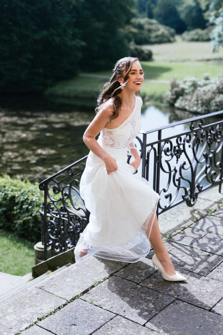 Wenn dein Brautkleid vor dem Kauf zu lang ist, ist das überhaupt kein Problem. So gut wie alle Kleider können vom Schneider gekürzt und an deine Bedürfnisse angepasst werden. Falls du aber erst am Hochzeitstag merkst, dass es zu lang ist (weil du vielleicht doch andere, niedrige Schuhe anziehen möchtest) gibt es auch eine Lösung! Falls dir die Länge Probleme beim Laufen bereitet, nimmst du einfach mit einer Hand auf Oberschenkelhöhe in der vorderen Mitte des Kleides beim Gehen oder auch dem Hochzeitstanz nach oben. Das klingt komplizierter als es ist, also kein Panik! Wenn ein Kleid zu kurz ist, kann vorab eine Spitzenkante oder Bordüre als Verlängerung angenäht werden. Oder du kombinierst dein Kleid mit einem unserer langen Petticoats, was dir einen tollen Brautlook gibt! Falls du es am großen Tag als zu kurz erachtest, kannst du etwas mit deinen Schuhen tricksen. Mit flacheren Brautschuhen kannst du es leicht verlängern. Da auch barfuß heiraten keine Seltenheit mehr ist, könntest du theoretisch (und abhängig von der Jahreszeit und deinem Hochzeitsstil) sogar ganz auf Schuhe verzichten. Oder du machst es gerade andersherum und gibst deinem Hochzeitskleid durch extrem hohe Schuhe einen knöchellangen Look und heiratest im Brautkleid mit 7/8 Länge!
