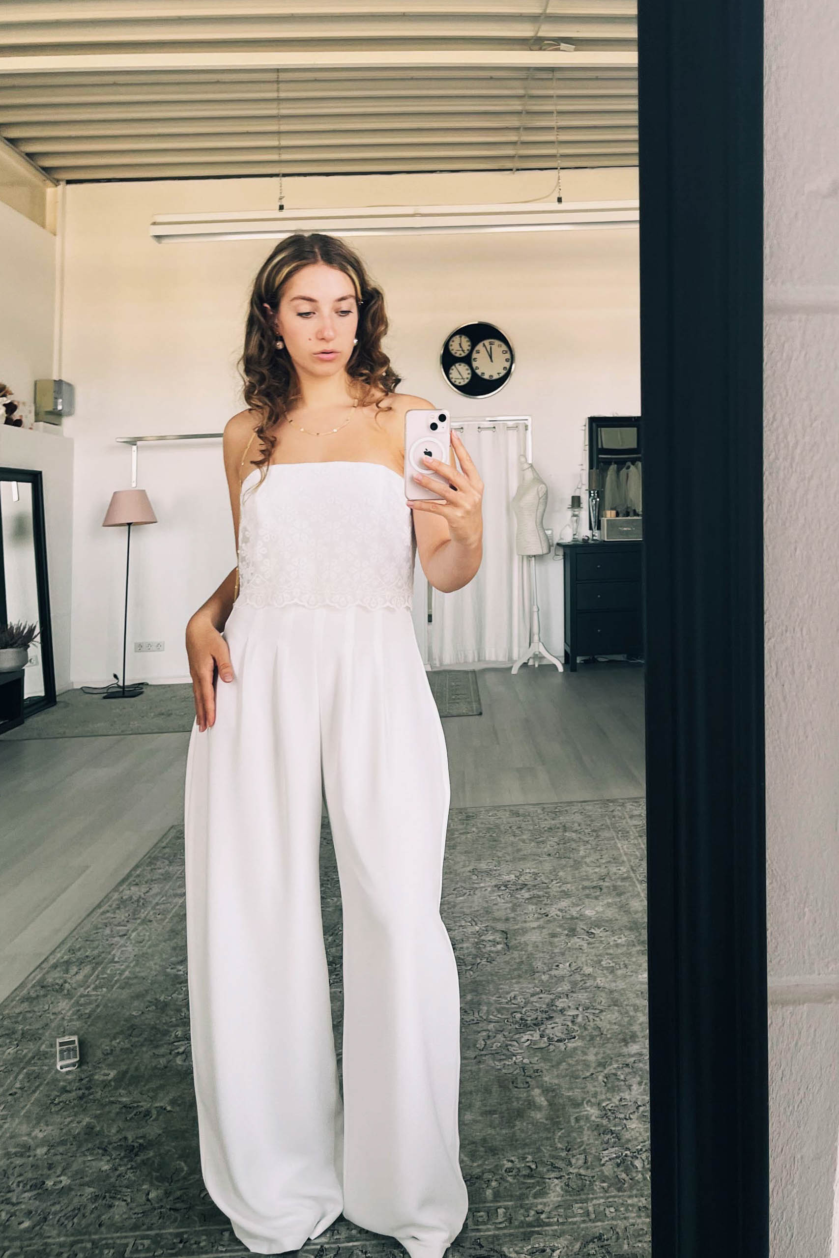 Deine Silhouette ist es ebenfalls, da wir unseren Brautjumpsuit mit schmaler Taille und aufspringenden Falten designed haben. So hat das Bein einen tollen und eleganten Fall, dass selbst fließende Brautkleider neidisch werden. ;-)