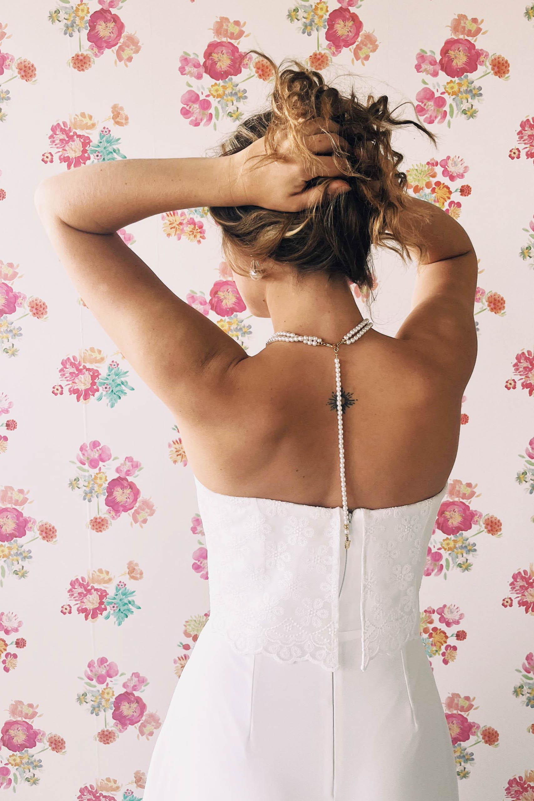 Hinten wird der Jumper mit einem Reißverschluss geschlossen und wenn du noch etwas wärmendes für deine Schultern suchst, ist unsere Brautjacken und Bolero Kollektion nur einen Klick entfernt. Schau‘ dir gerne noch die Falten und den Fall der Hose im Großformat an und freu‘ dich auf deine moderne, unkomplizierte und wunderschöne Hochzeit im schulterfreien Brautjumpsuit mit Spitze. Be a jumpsuit bride, be you, be happy!!!