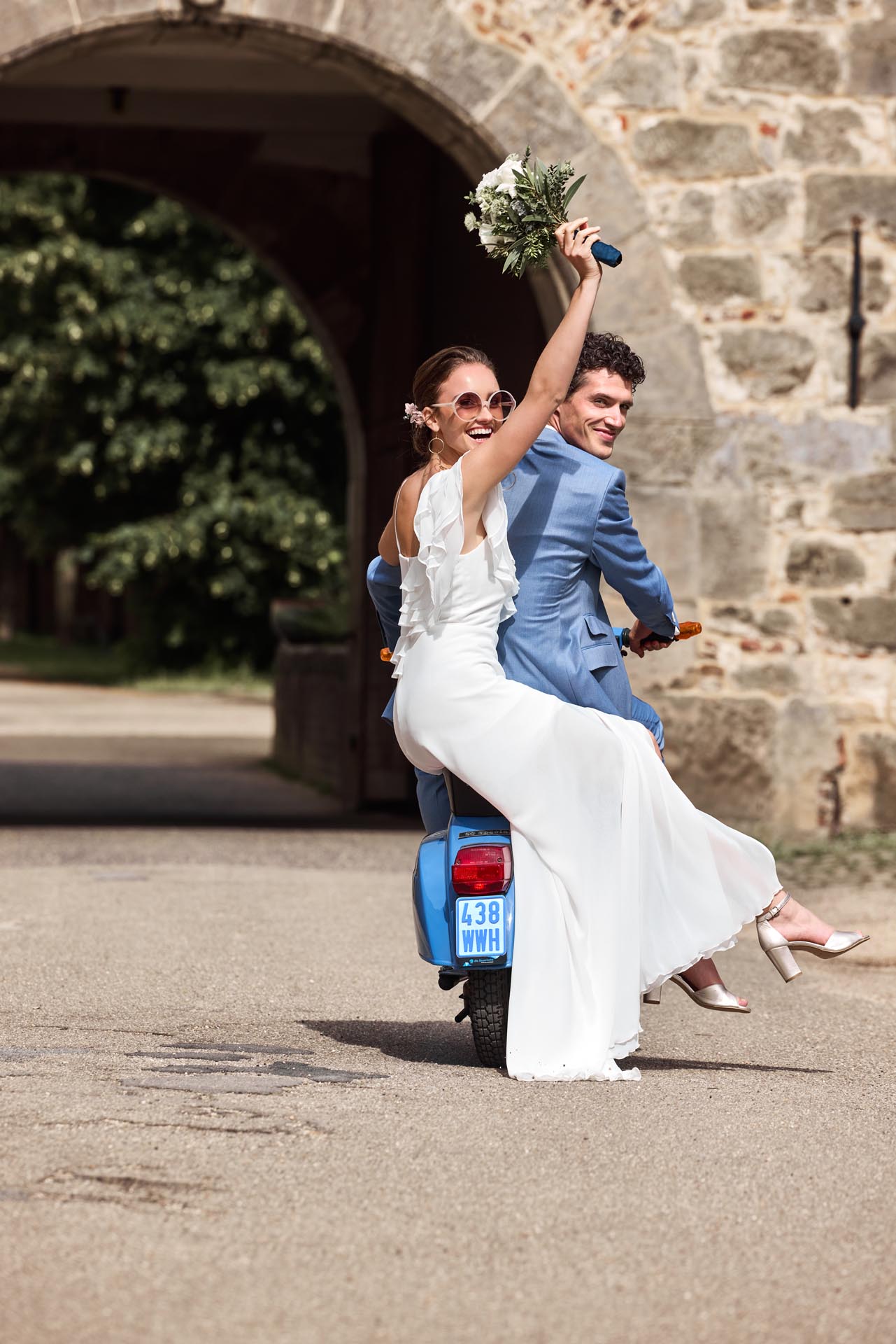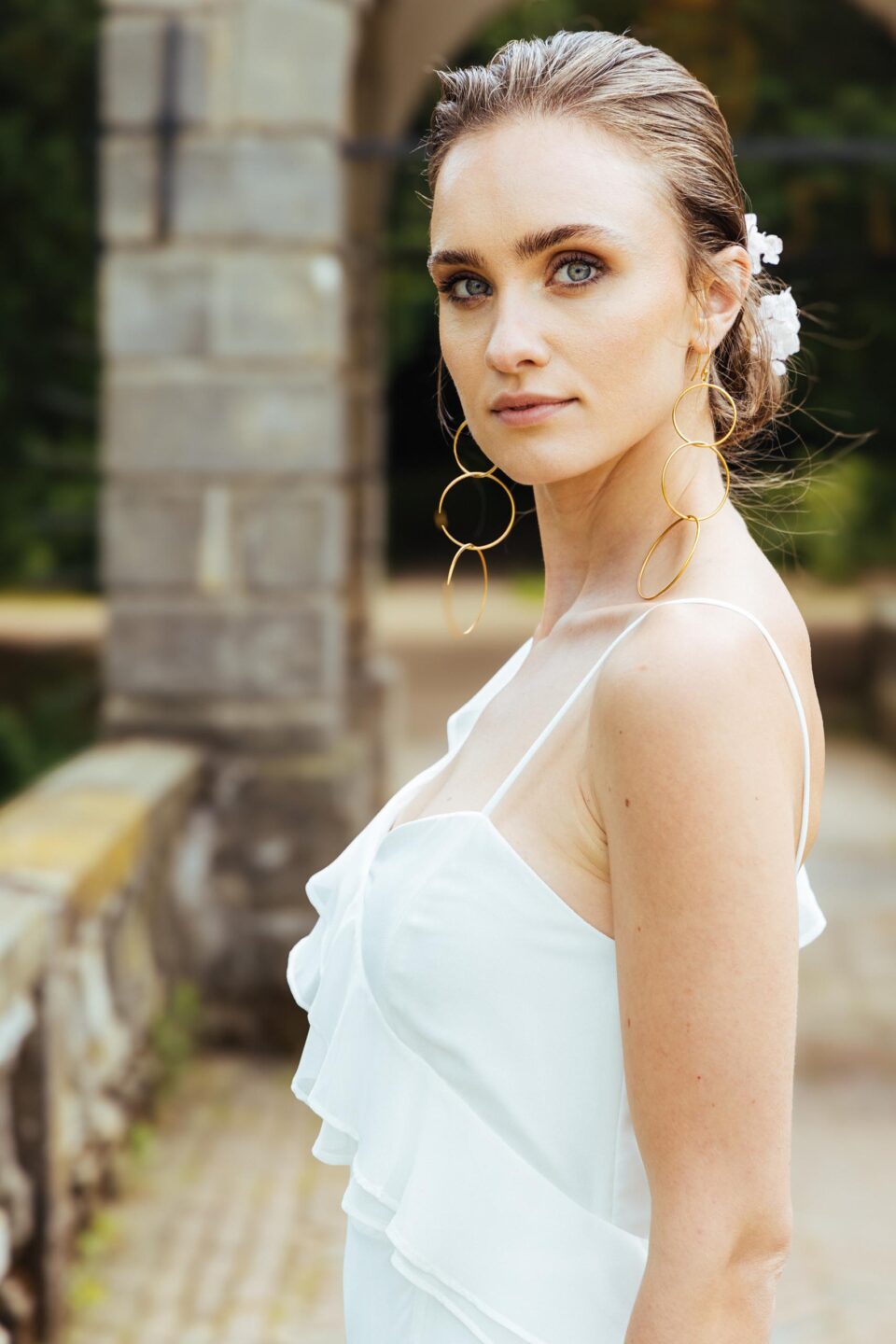KUESSdieFERLA ist aus recyceltem Chiffon, der wundervoll leicht zu tragen ist. Dadurch ist sie auch bei wärmeren Temperaturen eine unkomplizierte Brautbegleiterin und eignet sich gut für stilvolle Hochzeiten im Sommer. Außerdem ist das Kleid mit Schlitz für die verschiedensten Bräute geeignet. Wir sind sehr happy, dass wir euch auf dieser Seite gleich zwei wundervolle und ganz unterschiedliche Frauen darin zeigen dürfen, die mehr als 30 Jahre Altersunterschied aufweisen. Die bezaubernde Anja, die uns sonst als Schminktante mit den coolsten Brautstylings unterstützt, beweist hier doch wirklich auf wunderschönste Weise, dass dieses Chiffon Brautkleid für Bräute jenseits der 50 eine total gute Wahl sein kann. Aber auch der bedeutend jüngeren Braut steht das schmale Kleid mit Volants einfach hervorragend.