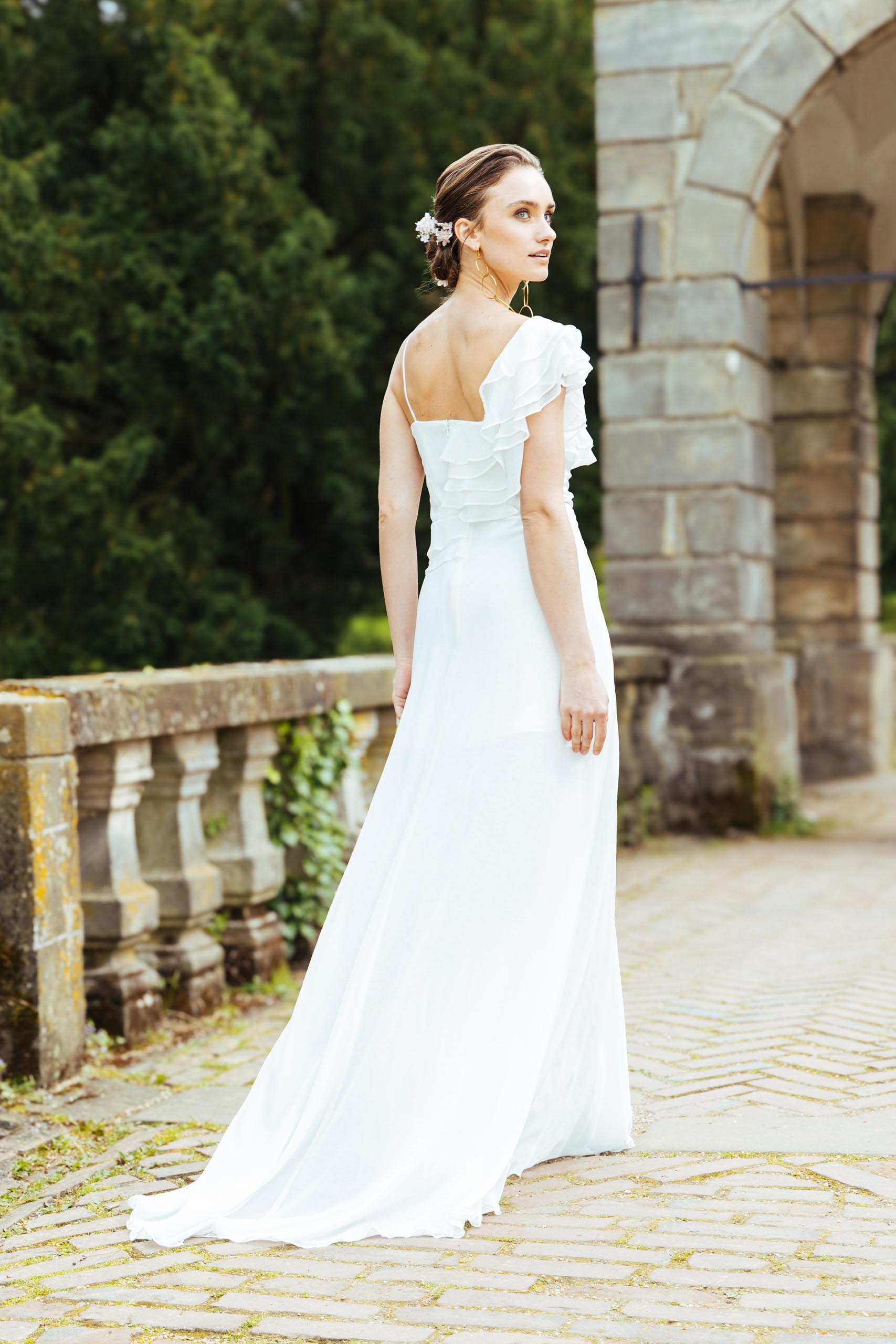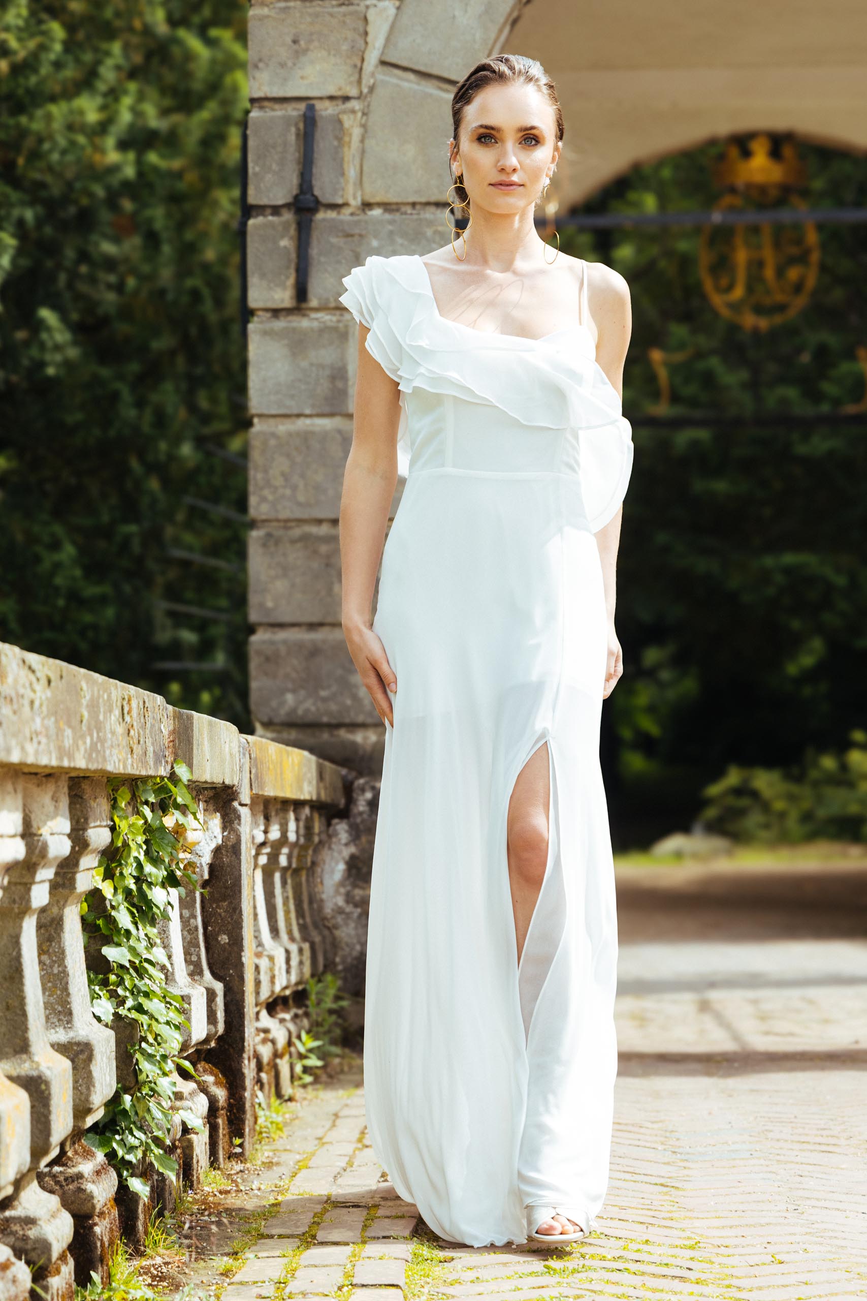 Nachhaltiges Hochzeitskleid mit asymmetrischem Ausschnitt