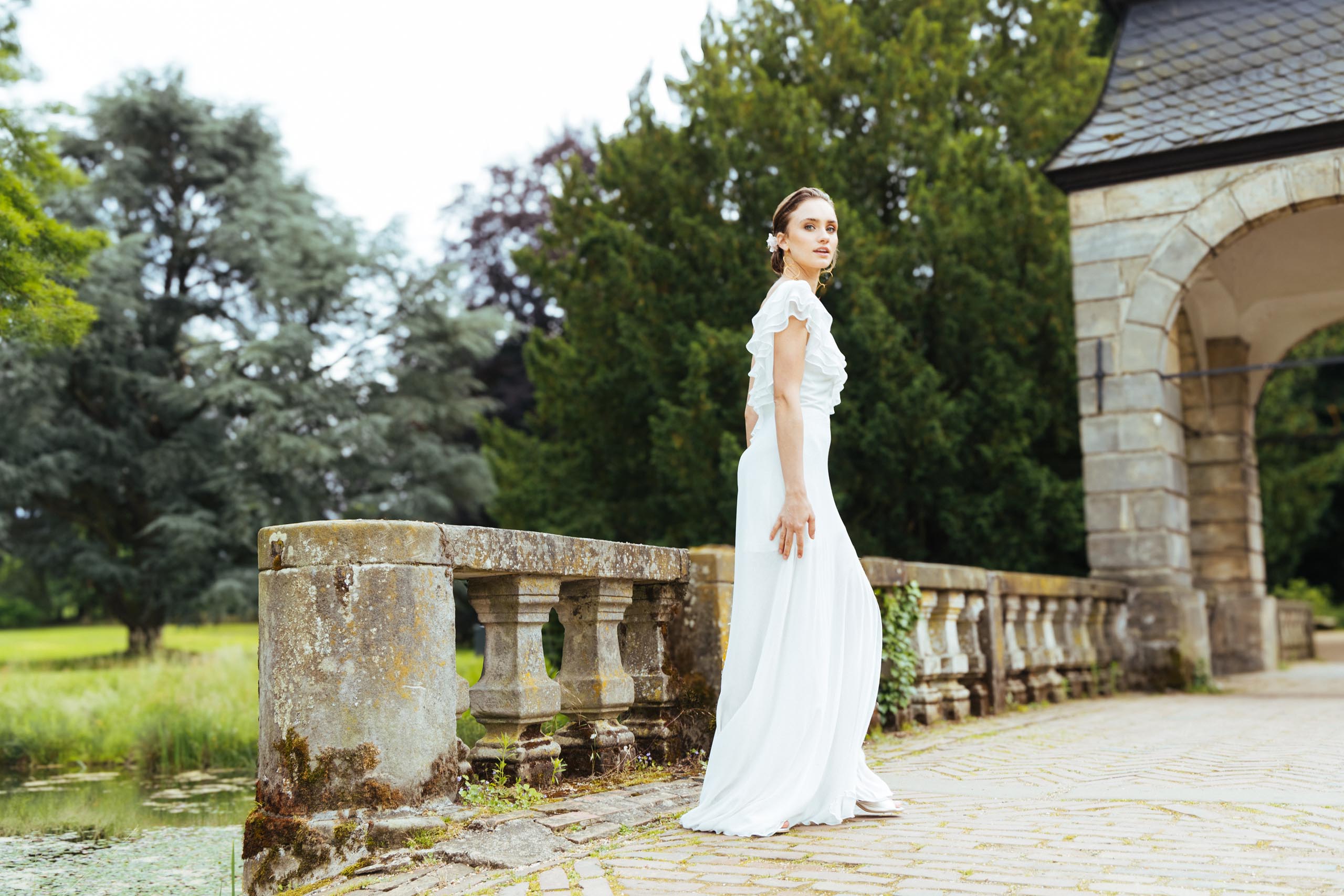 Chiffon Brautkleid mit asymmetrischem Ausschnitt & außergewöhnlichem Volantärmelchen