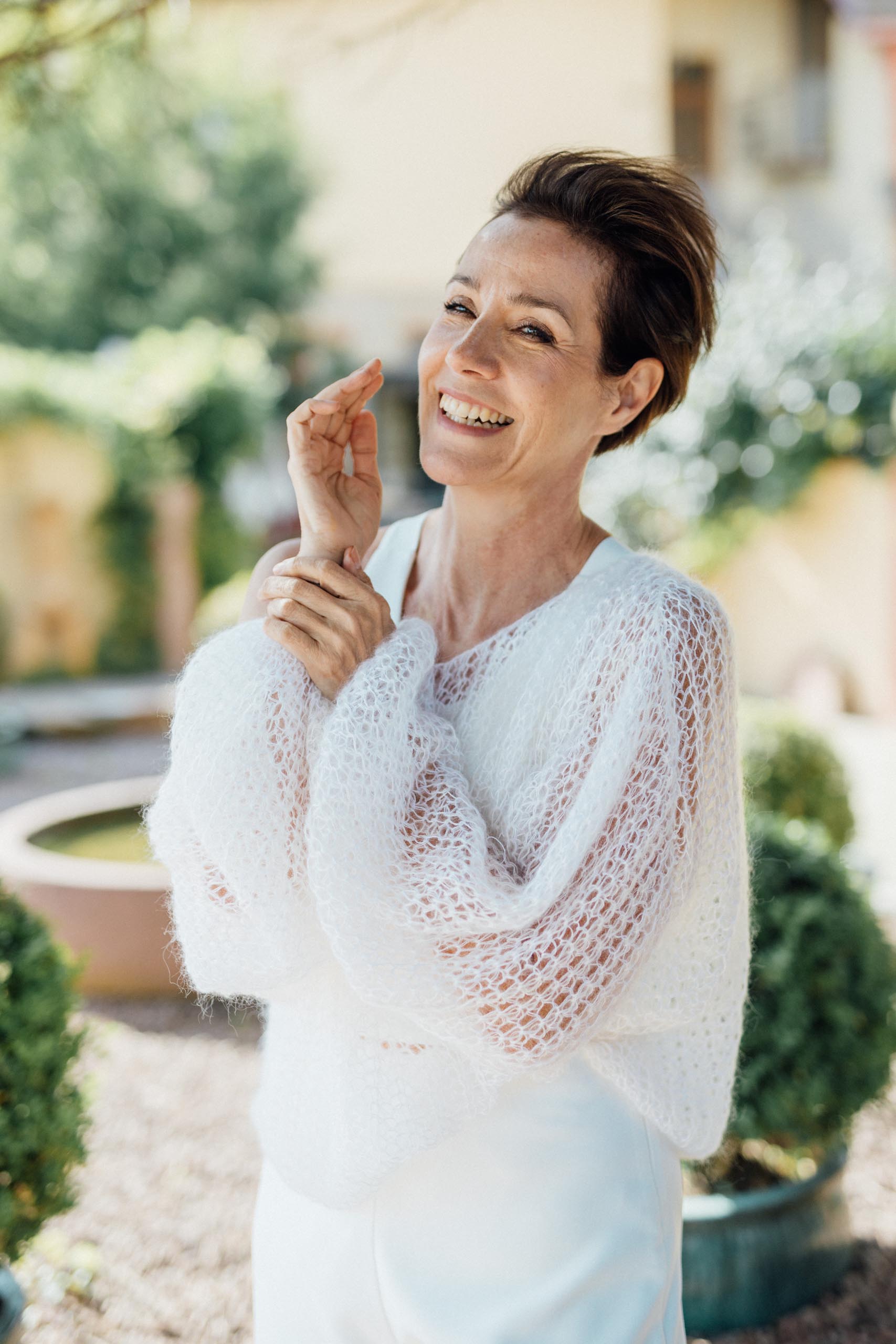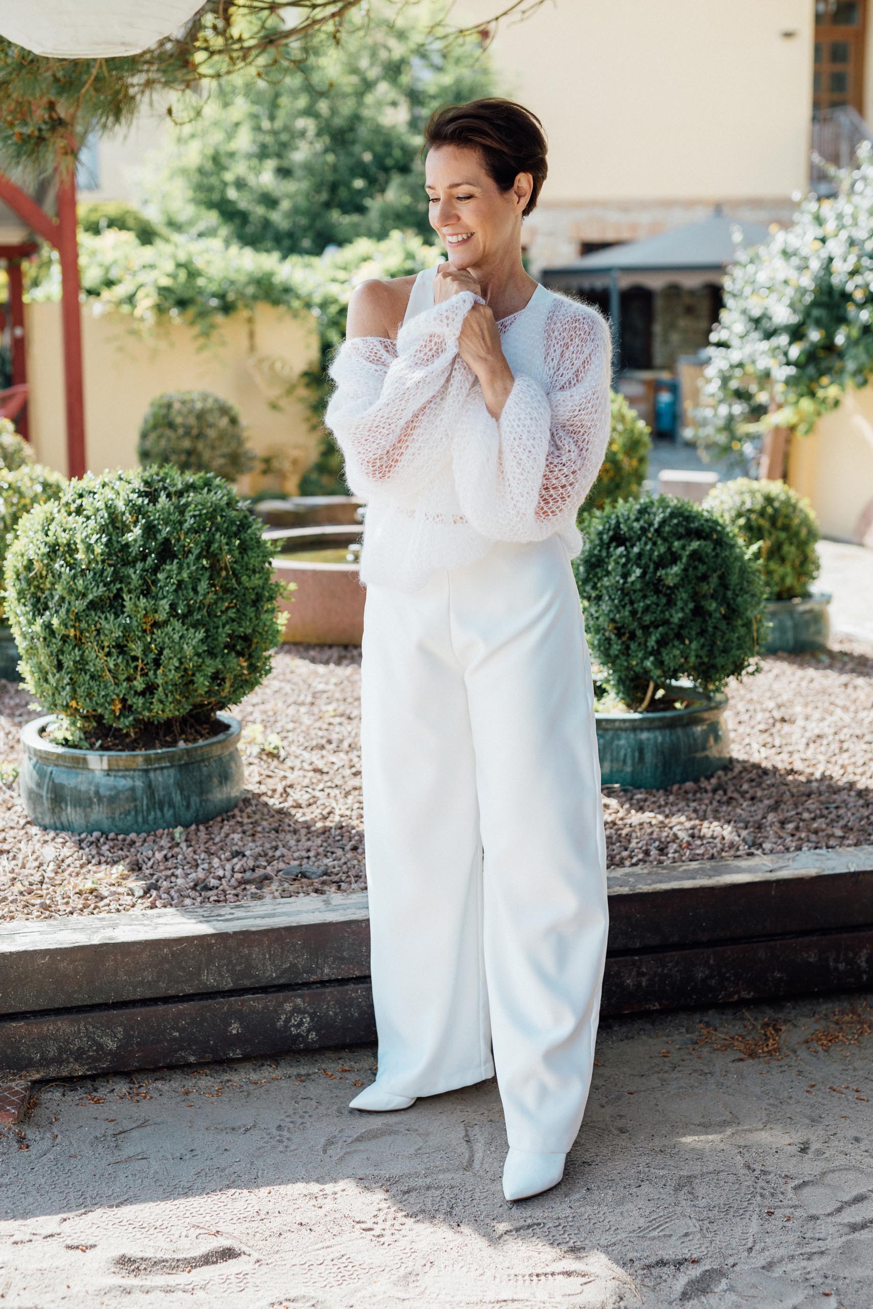 Falls du von dem matt schimmernden Satin der Hose nicht genug bekommen kannst, ist die kurze Corsage KUESSdieZOE dein Brautoberteil-Buddy! Über die schlichte Corsage mit rundem Ausschnitt und schmalen Trägern könntest du auch den stylischen Oversize Brautpulli kombinieren. Er passt zu jeder Corsage und wir sind uns sicher, dass du den kuscheligen Pullover auch nach deiner Hochzeit abfeiern und tragen wirst. Beim Fotoshoot haben wir das besondere Grobstrick Lieblingsstück über das Stretch Brauttop T-1093 gezogen. Das sportive Oberteil ist genau wie die high waist Hochzeitshose toll zu tragen und sorgt durch den femininen Ringerrücken für eine schöne Rückansicht.