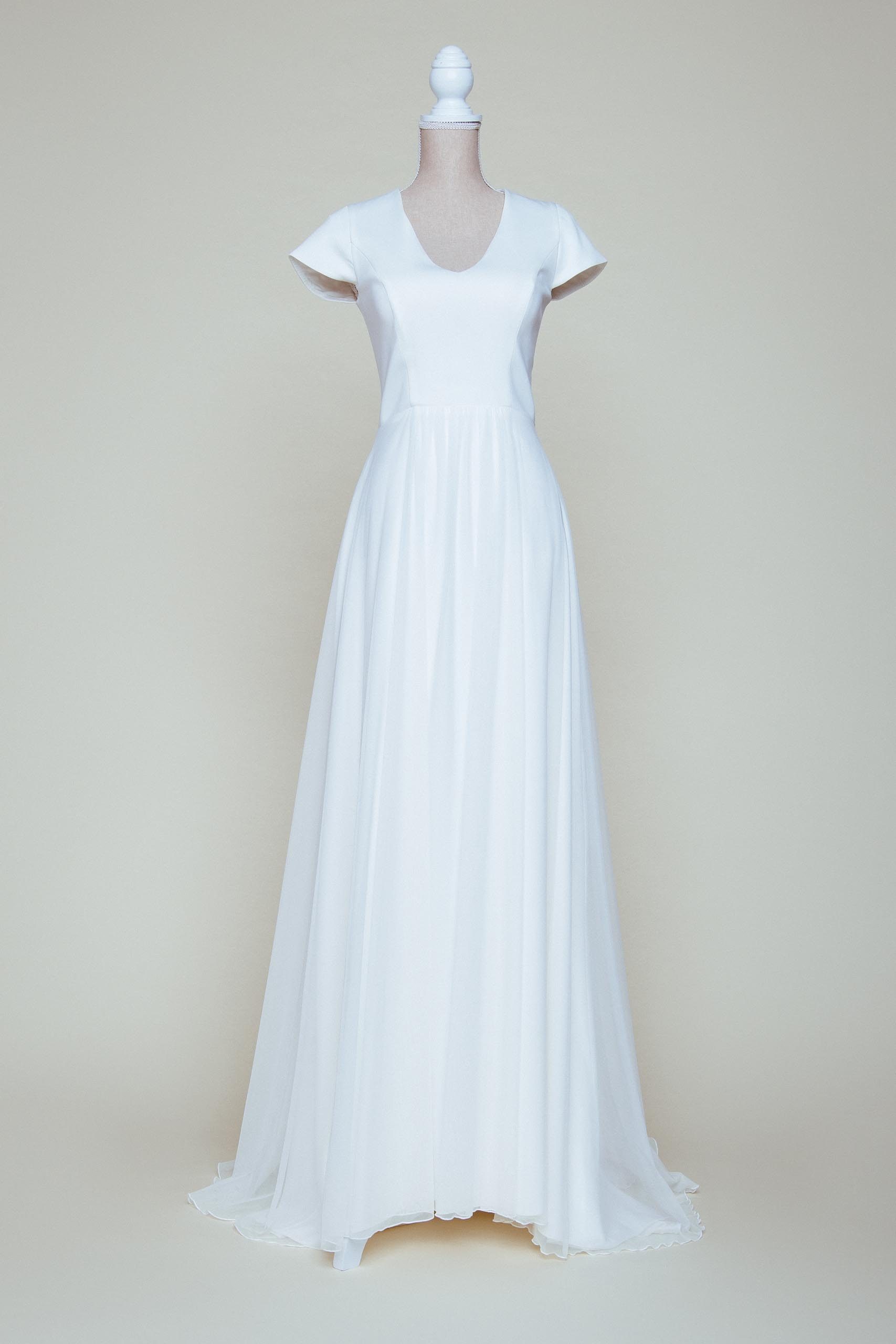 - Schlichtes Hochzeitskleid, Oberteil mit tiefem V-Ausschnitt & Kurzarm, Rock mit Schleppe in Soft-Tüll, Raffung nur mittig